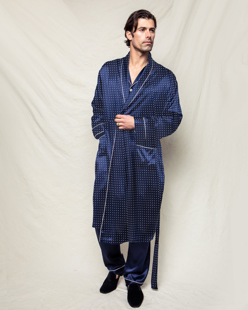 Men's Silk Long Robe in Navy Polka Dot